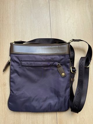 Bolso de Adolfo Domínguez con un diseño elegante y práctico. - Material textil en color azul metálico. - Detalles y ribetes en piel marrón. - Correa ajustable para llevar al hombro o cruzado. - Bolsillo exterior con cremallera. - Bolsillo interior con cremallera. - Interior con compartimentos. Medidas aprox: 23,5cm ancho x 17cm alto