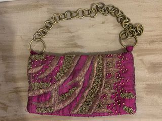 Elegante bolso de mano Adolfo Domínguez, impecable - Diseño con bordados y pedrería. - Cadena metálica dorada para llevar al hombro o como asa. - Tejido principal en color morado vibrante.