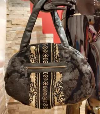 Bolso de hombro de piel de cordero con un diseño único. - Material: Piel de cordero. - Diseño: Combinación de texturas y estampados. - Cierre: Cremallera. - Asas: Dobles asas de piel.