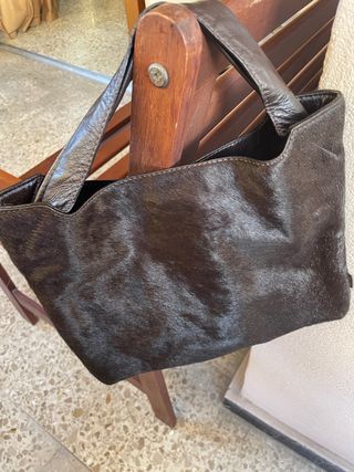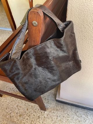 bolso de mano volor chocolate de piel de potro, interior forrado con bolsillo interior