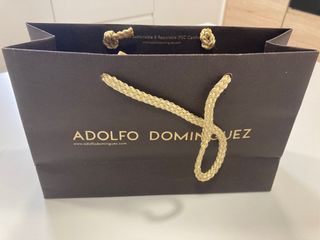 Bolsa de pepel resistente de la marca Adolfo Dominguez. Buen estado. Color marrón con letras y asas doradas. Ideal para llevar complementos. ancho: 26cm alto: 17cm fondo: 9cm