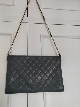 Elegante bolso de vestir, color negro. Es de estilo bandolera, con cadena dorada. -Forrado seda negra.puede usarse como bolso de mano, sin cadena. Tiene un diseño acolchado con forma de sobre. - Perfecto para ocasiones especiales.Medidas: 29 cm ancho por 19 cm alto.