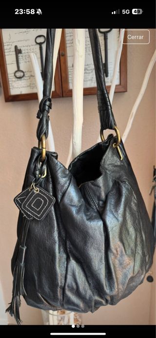 Bolso de piel de Adolfo Domínguez. - Diseño moderno y versátil. - Cierre principal seguro. - Asa cómoda para llevar al hombro. - Detalle de flecos y charm. - Medidas: 30 x25cm