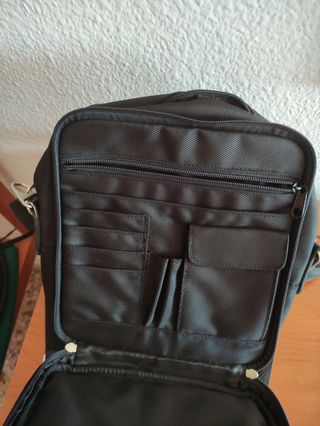 bolso bandolera, negro de piel. cabe un portatil, Tiene diferentes compartimentos. lleva cinta para llevarlo bandolera. no se ha usado nunca. tiene bolsa de tela donde puedes guardarlo.