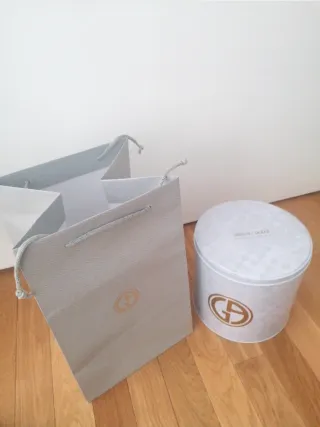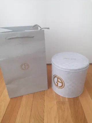 Conjunto de caja redonda y bolsa de mano a juego de la marca Armani. - Caja redonda con diseño. - Bolsa de mano a juego. Preciosa para regalar o decorar. Solo envio.