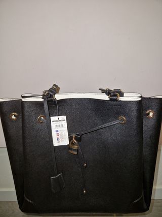 Precioso bolso tote de Pedro del Hierro, a estrenar. Es de color negro, con un diseño elegante y sofisticado. - Asa de mano y asa bandolera. - Cierre con cordón y detalles dorados. - Material de piel auténtica.
