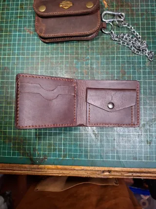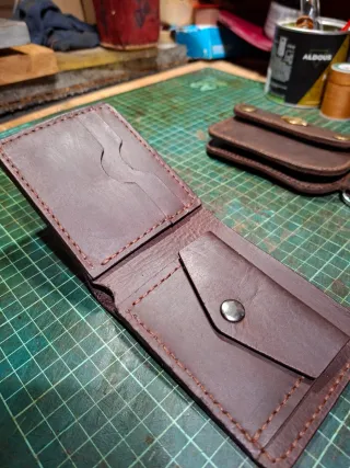 Conjunto de billeteras de cuero auténtico, elaboradas artesanalmente. - Material: Cuero genuino. - Diseño: Bifold. - Acabado: Costuras visibles.