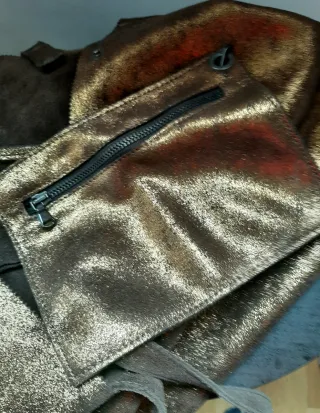 Bolso tipo tote de piel auténtica con un acabado metalizado en tonos dorados y amarronados. Para llevar en el hombro con doble asa. Contiene bolsita interior. El bolso presenta signos de uso en su interior (manchas de bolígrafo, ver foto). A pesar de esto es un bolso muy llamativo con piel de calidad. Bolso con capacidad pues mide 54 cms ancho x 33 cms alto. Las asas miden 20 cms. Cierre con broche.