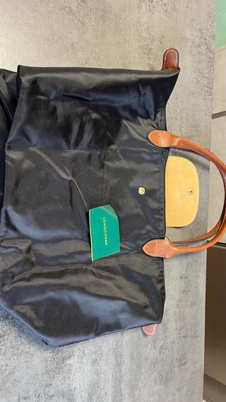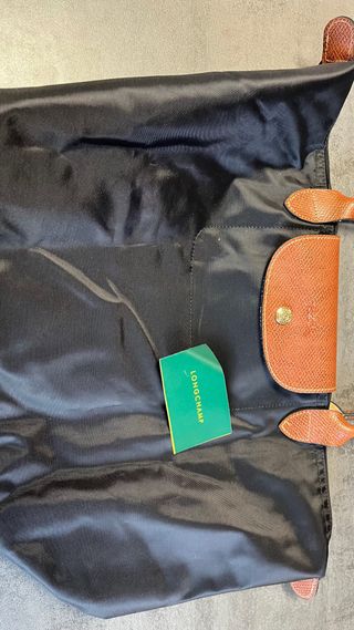 Bolso de mano Longchamp en color negro con detalles en marrón auténtico - Material de nylon resistente. - Asas de cuero. - Cierre de botón a presión.