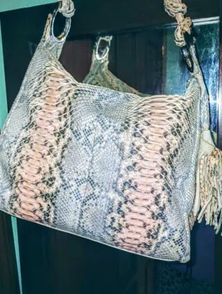 Precioso bolso de mano Cromia. Está en muy buen estado, con un diseño elegante y sofisticado. - Piel de serpiente auténtica. - Detalles en marrón oscuro. - Herrajes dorados. - Asa de mano.