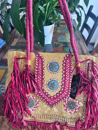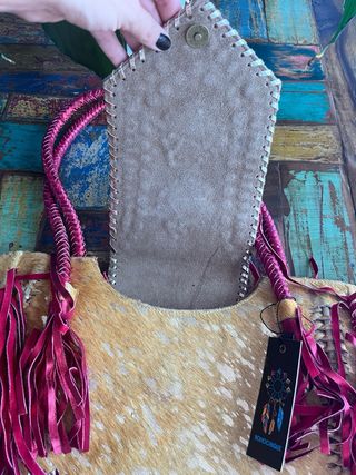 Bolso de piel auténtica con un diseño boho chic y detalles únicos. No hay dos iguales. Hecho a mano - Adornos con piedra natural - Flecos - Asas trenzadas. - Cremallera exterior y bolsillo interior también con cremallera. solapa de imán. - Bolsillos laterales con imán. - Diseño con flecos. - Detalles metálicos. - Asas trenzadas.