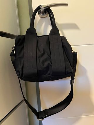 Bolso de la marca BIMBA Y LOLA en color negro con detalles dorados. - Diseño moderno y funcional. - Compartimentos exteriores con cremallera. - Asas cómodas para llevar al hombro o en la mano.