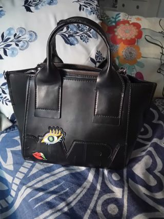 Bolso de mano Bimba y Lola en color negro. Presenta un diseño moderno con apliques. Medidas 30cm de ancho por 20cm de alto aprox. - Cierre de cremallera. - Dos asas. - Detalle de ojo y labios.