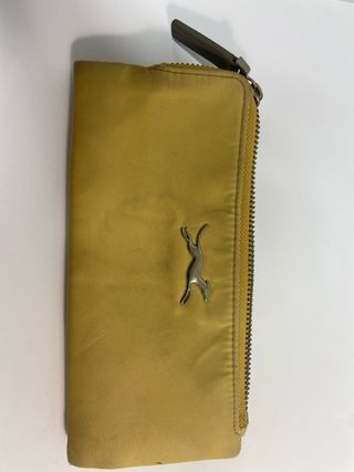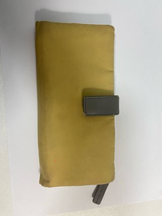cartera de lona color amarillo tiene 8 huecos para tarjetas y cremallera con 3 secciones para monedas.