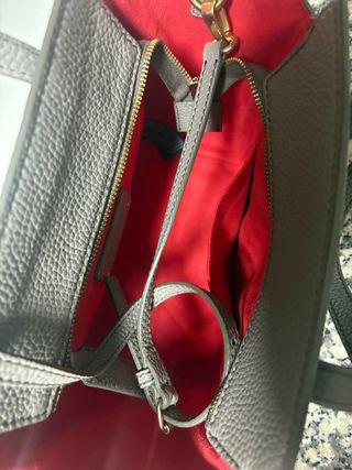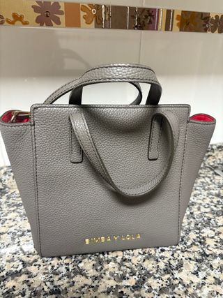 Bolso de mano Bimba y Lola en color gris. Presenta un diseño moderno y elegante, con detalles en rojo en su interior. - Material: Piel texturizada. - Logo de la marca en dorado. - Asas de mano. Esta apenas sin uso como nuevo Precio 80€