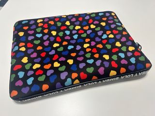 Funda para portátil con un alegre estampado de corazones en varios colores sobre fondo negro. El borde de la funda muestra el logo de la marca. - Diseño de corazones multicolor. - Fondo negro. - Logo de Bimba y Lola en el borde.