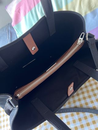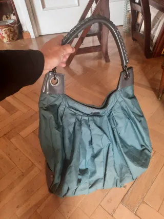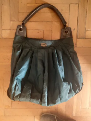 Bolso Bimba y Lola con un diseño moderno y espacioso. Bolsillos interiores , buen estado general. Un pequeñísimo agujerito en última foto q no se ve por los frunces del bolso. - Material exterior de tela impermeable. - Base y detalles en piel vegana. Muy cómodo al hombro