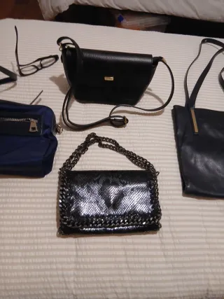 Conjunto de bolsos. - Bolso azul con correa. - Bolso negro con correa. - Bolso pequeño con cadena.