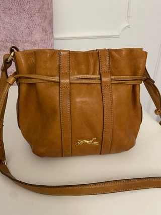Bolso bombonera de piel en color marrón. - Detalle de logo dorado. - Cierre de cordón. - Asa larga ajustable.