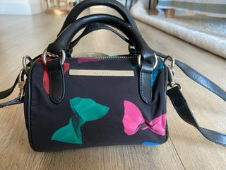 Bolso pequeño de Bimba y Lola con un llamativo estampado. prácticamente nuevo con muy poco uso. - Diseño compacto y moderno. - Asas superiores de cuero negro. - Correa ajustable para llevar al hombro.