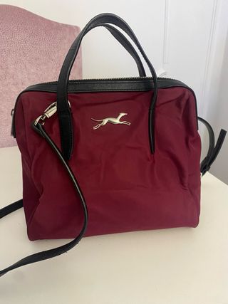 Bolso de mano y bandolera de la marca Bimba y Lola. - Color rojo. - Logo metálico de galgo. - Asa corta y correa larga ajustable. - Cierre con cremallera.