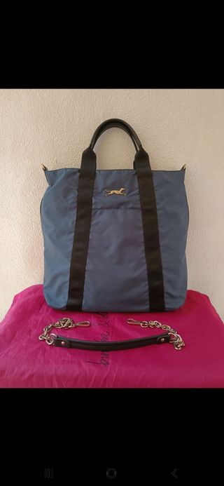 Bolso de Bimba y Lola. Para llevar de mano o como bandolera. Hecho de nylon y poliuretano. El forro interior de Nylon. Bolsillo Inter en el frente y dos interiores. Color azul marino y negro. Ancho 35cm y altura 37cm. No incluye funda guardapolvo.