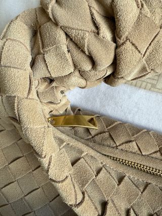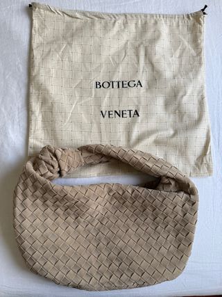 Bolso de mano de Bottega Veneta en color beige. Incluye su bolsa guardapolvo. - Diseño tejido característico. - Asa con nudo. - Material de ante.