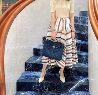 Lo compré porque me encanta el estilo minimalista de Bottega Veneta y este modelo es súper versátil. Pero al final casi no lo uso porque tengo otro bolso parecido que uso más a diario. Está muy bien cuidado, casi nuevo. Precio negociable. - Diseño tejido en tonos azules. - Detalle metálico dorado. - Asas de cuero.