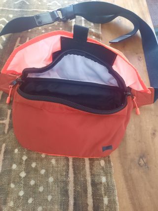 Original bandolera Camper, granate, naranja y negra. Muy practica para viajar.