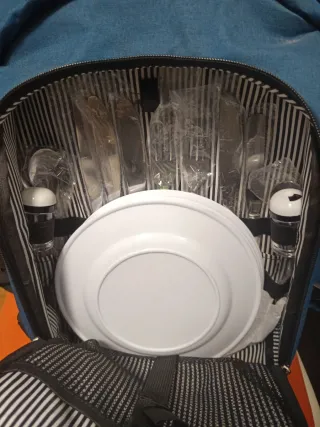 Mochila de picnic en color azul, lista para usar. - Incluye platos, cubiertos, vasos y mantel