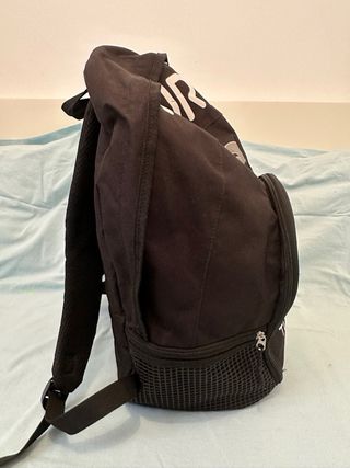 Mochila negra con el logo de Turbo y el texto WP CAMP. - Diseño moderno y funcional. - Compartimento principal espacioso. - Bolsillos laterales de malla. - Cierre con cremallera.