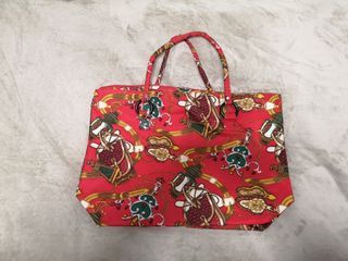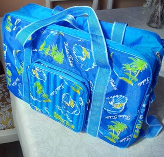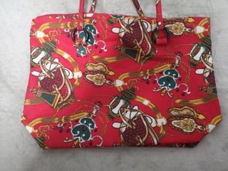 Bolsa estampada con motivos, con asas, cremallera y bolsillo con cremallera interno. Medidas: 56 cm x 37 cm aproximadamente. Etiquetas: bolsa, bolso, campo, playa, piscina, cremallera, transportar.