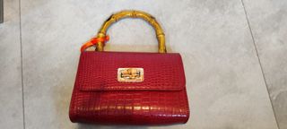 Mini bolso sin estrenar de piel sintética y mango y cierre de bambú trabajado de manera artesanal. Es color burdeos Marca Campo Marzio PvP en Italia 50€ Madrid Ciudad Lineal
