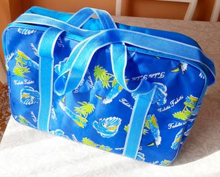 Bonita bolsa térmica para mantener el frescor de bebidas y comidas en excursiones al campo o para ir a la playa. Es impermeable por fuera. Tiene un bolsillo en uno de los laterales (ver en fotos) con cierre de cremallera. Medidas: 41 cms. de ancho 30 cms. de alto 12 cms. de fondo