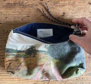 Pouch de la firma ZUBI, edición limitada SALLY HAMBLETON. La imagen impresa digitalmente es la antigua casa de campo de Sally (lleva las coordenadas en la chapa del cierre y en el interior) y el forro interior es de color azul. Tamaño mediano (ver medidas en la penúltima foto). Es de algodón, correa de cordina y cremallera de aluminio YKK. Hecho en los talleres de la firma en Cuenca. Se entrega con funda guardapolvo. En perfecto estado.