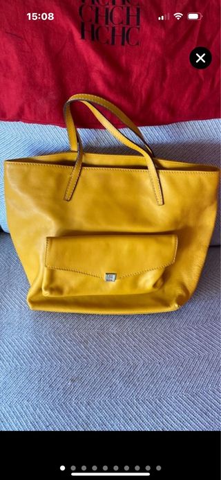 Bolso de mano Carolina Herrera en color amarillo. - Elaborado en piel. - Bolsillo exterior con cierre de solapa. - Detalle metálico en el bolsillo. -Rozadas un poquito las esquinas delanteras del uso.(ver fotos) Lo demás está perfecto. Se puede ver sin compromiso