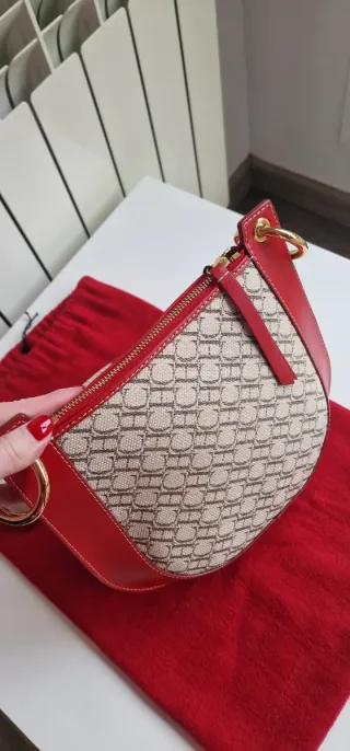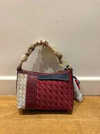 Bolso de mano con un diseño elegante y moderno. - Combinación de colores beige y rojo. - Detalle de logo de la marca. - Asa con detalle metálico.