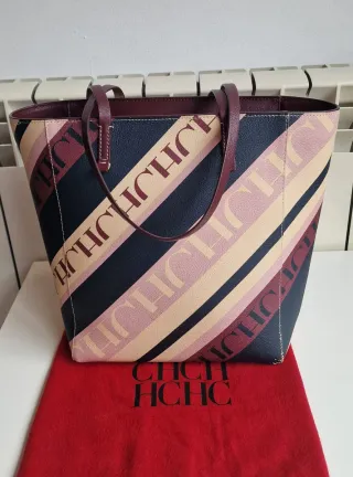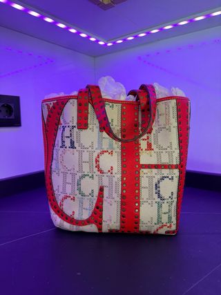 Bolso de Carolina Herrera con un diseño llamativo. - Estampado con el monograma de la marca. - Detalles de las letras 'CH' en varios colores. - Interior en contraste de color rojo. - Cierre de cordón ajustable. - Correa de hombro ajustable. OJO POCO USO, solo tiene de un lado un poquito las letras borrosas del resto todo bien etiqueta guardapolvos medidas 28cm 28cm alto fondo 14cm REPITO NUEVO