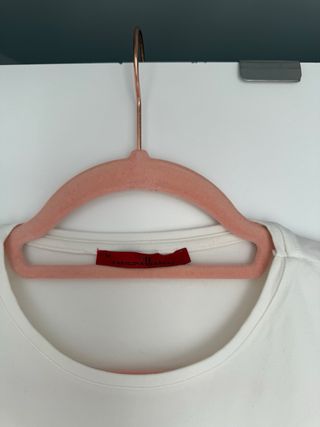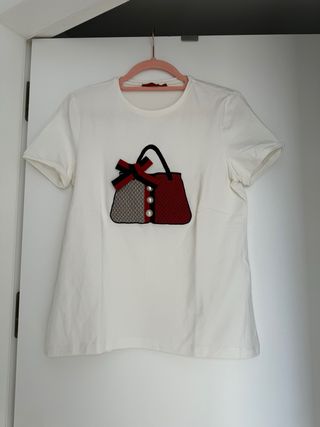 Camiseta blanca de manga corta con un original aplique frontal. - Diseño de bolso con lazo y perlas. - Detalle de tejido texturizado. Etiqueta de composición está cortada.