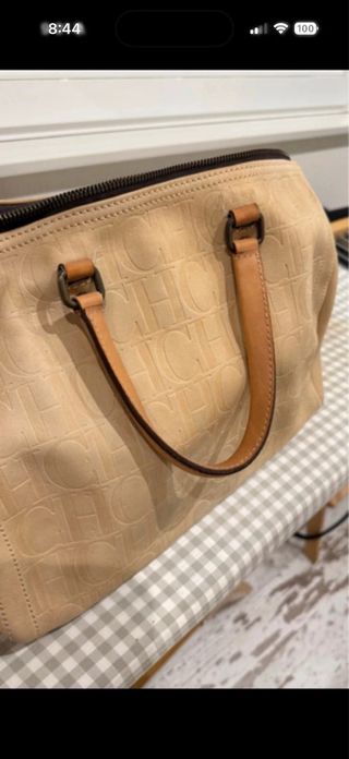 Bolso Carolina Herrera modelo Andy Boston en piel color beige. Un diseño elegante y versátil. - Piel de alta calidad con monograma CH en relieve y decorado con elegantes detalles de puntadas. - Asa de mano en cuero. - Cierre con cremallera superior. - Bolsillo interior. - Interior en piel, acabado natural. - Medidas: ancho 37, alto 27, fondo 20. - Algunas zonas oscurecidas por el uso.