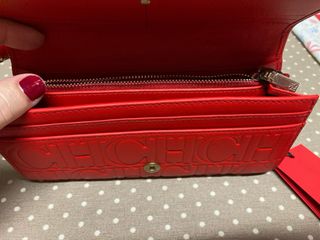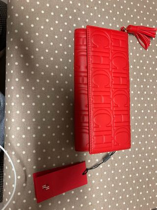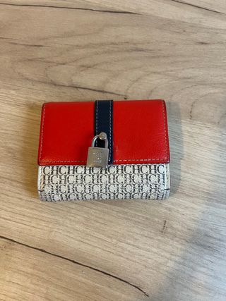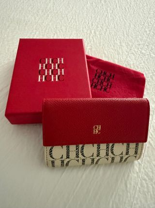 Elegante cartera monedero de Carolina Herrera. - Diseño bicolor con el monograma CH. - Parte superior en piel roja. - Incluye caja y funda protectora.
