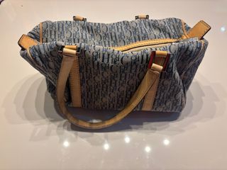 Bolso bowling de Carolina Herrera con el icónico monograma. - Diseño mini. - Combinación de colores beige y azul. bolso CH Carolina Herrera original, tipo bowling / boston mini en lona jacquard monograma CH azul efecto “denim” con detalles en piel color camel/amarillo y herrajes plateados. 📏 Medidas aprox.: 26 cm ancho × 18 cm alto × 12 cm fondo 👜 Cierre con cremallera superior. ✅ Logo CH en herrajes y placa interior. 📌 Estado: usado, con señales normales del uso (ver fotos). Ideal para diario, muy cómodo y con buena capacidad para su tamaño.