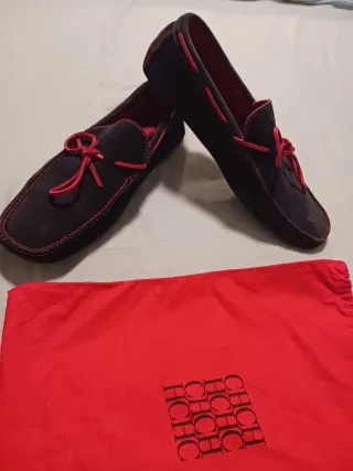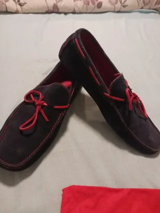 Mocasines de ante con detalles en contraste. - Color exterior azul marino - Forro interior y cordones en rojo. - Costuras visibles. - Incluye bolsa guardapolvo.