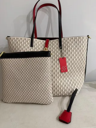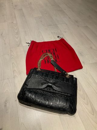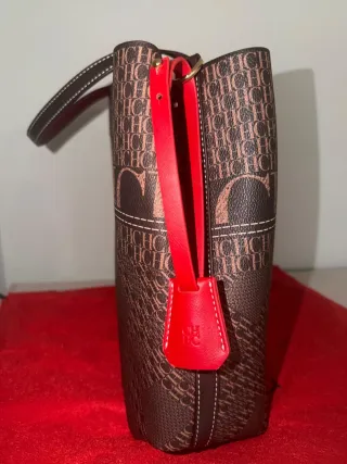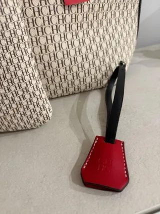 Elegante bolso Carolina Herrera con un diseño distintivo. Se ha llegado a usar 3/4veces. - Estampado con el monograma CH. - Asas en contraste de color rojo y negro. - Incluye neceser a juego. - Detalle de colgante rojo.