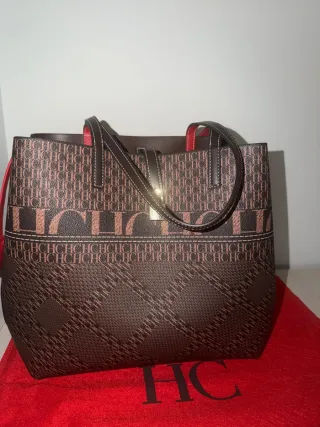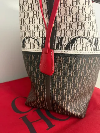 Elegante bolso tote de Carolina Herrera con su distintivo estampado CH. Incluye un neceser a juego. Se ha usado 3 veces - Estampado CH en marrón y blanco. - Ribetes y asas en color rojo y marrón.