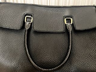Bolso de piel con un diseño elegante y detalles en contraste. - Acabado texturizado. - Cierre de cremallera. - Bolsillos frontales con solapa y hebilla. - Asas superiores. - Costuras decorativas.