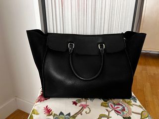 Elegante bolso de Carolina Herrera en piel negra. Es el icónico modelo VENDÔME. Elegante, sofisticado y versátil. Interior en piel vuelta con cartera en piel color cuero con logo. Está impecable. - Material: Piel texturizada. - Color: Negro. - Diseño con asas superiores y detalles metálicos dorados.
