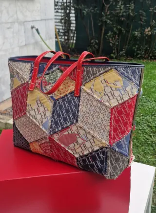 Bolso de mano Carolina Herrera con un diseño patchwork único. - Combinación de tejidos y estampados. - Asas de piel rojas. - Interior forrado en rojo.