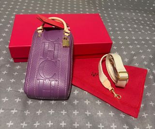 Bolso bandolera Carolina Herrera modelo Andy 1 Locked. - Color púrpura con detalles dorados. - Cierre de candado. - Incluye correa ajustable.