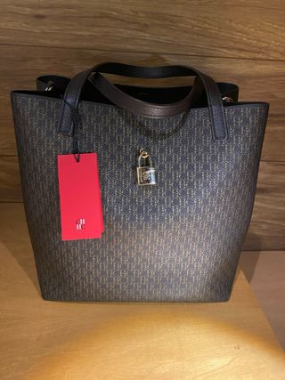 Elegante bolso de Carolina Herrera con un diseño monograma. - Color marrón con detalles dorados. - Incluye candado decorativo. - Disponible funda,caja y bolsa. - Altura 27 cm,ancho 27 cm , fondo 16 cm.En el centro lleva un bolso con cremallera, también con el anagrama CH.